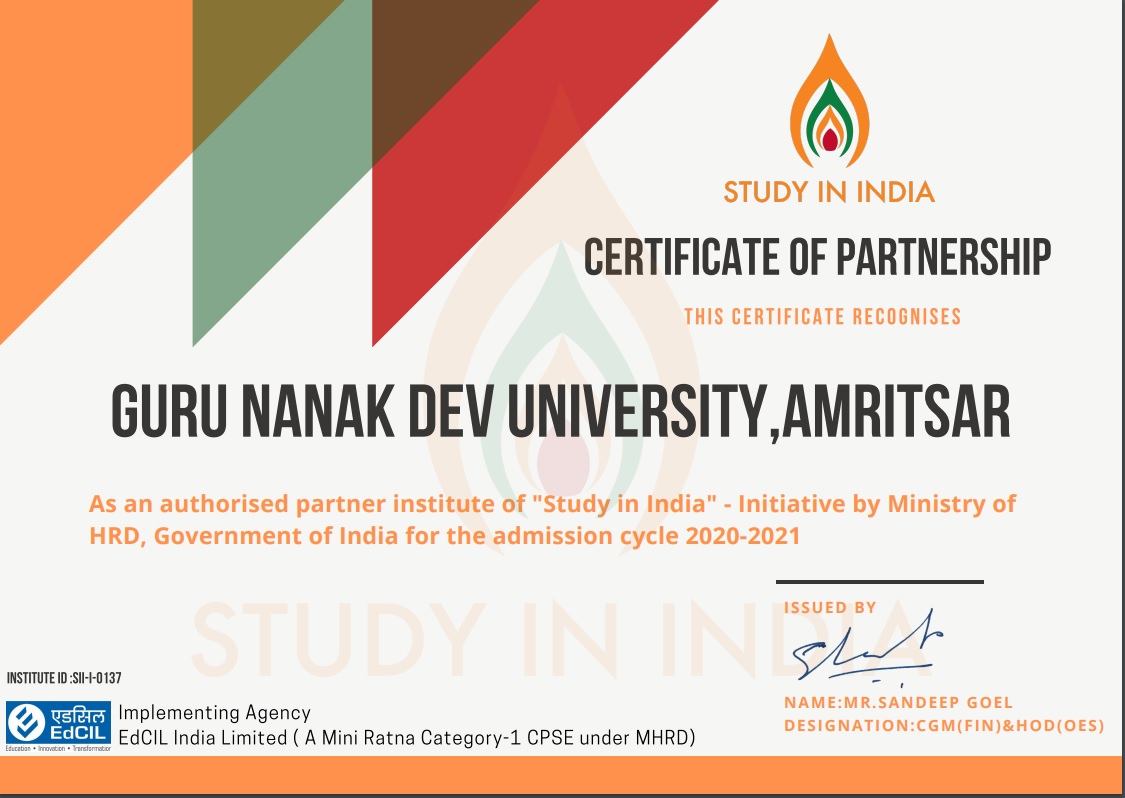 MoU Signed between GNDU and EdCIL (INDIA) LIMITED, A CPSE UNDER MHRD, IMPTEMENTING PARTNER FOR STUDY IN INDIA, A PROGMMME UNDER MINISTRY OF HUMAN RESOURCE DEVELOPMENT, GOVERNMENT OF INDIA (on 10 January 2019...